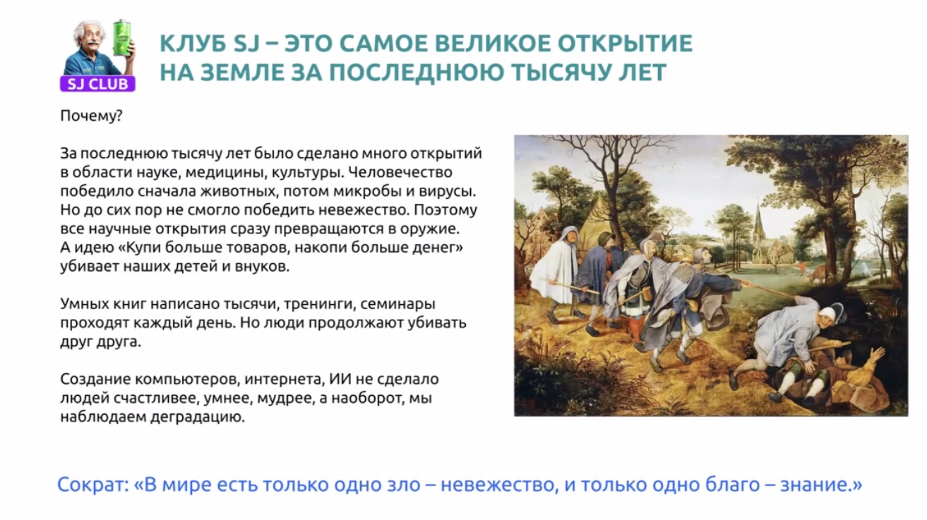 После завершения курса трансформации люди не остаются в одиночестве. Они получают доступ в интеллект-клуб онлайн, где встречаются люди с похожими ценностями и стремлениями. В Красноярске, как и по всей России, члены клуба собираются еженедельно в формате видеоконференции.